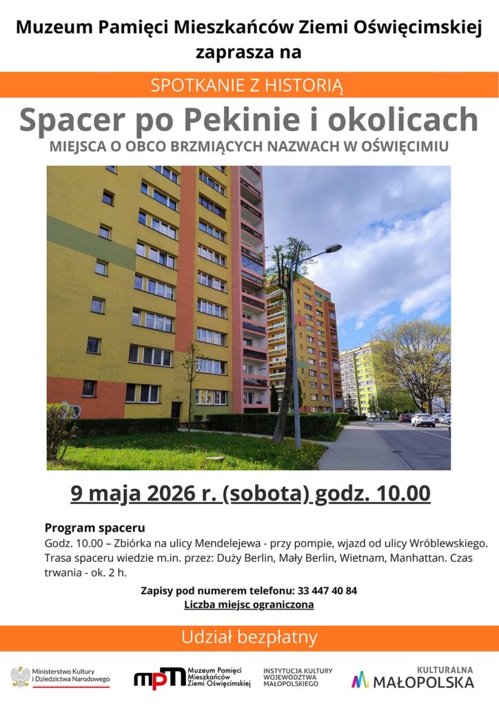 Rozpoczęcie 9 maja 2026 r. (sobota), godz. 10.00. Zbiórka na ulicy Mendelejewa – przy pompie, wjazd od ulicy Wróblewskiego. Czas trwania – ok. 2 h. Spacer poprowadzi licencjonowany przewodnik po Oświęcimiu Piotr Tarczyński.